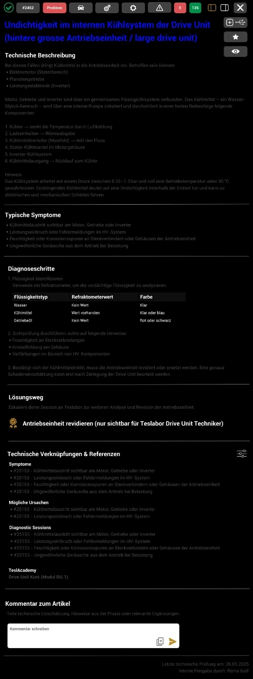 The technical knowledge base is the core of TeslaboX when it comes to structured Tesla expertise. Here, you’ll find detailed articles on both common and rare fault patterns – thoroughly analysed, clearly documented and immediately applicable.